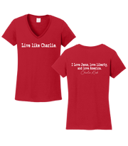 Our Live Like Charlie Ladies T-Shirt has a stylish V-Neck, and is printed on a Rich Red Ladies T-Shirt.