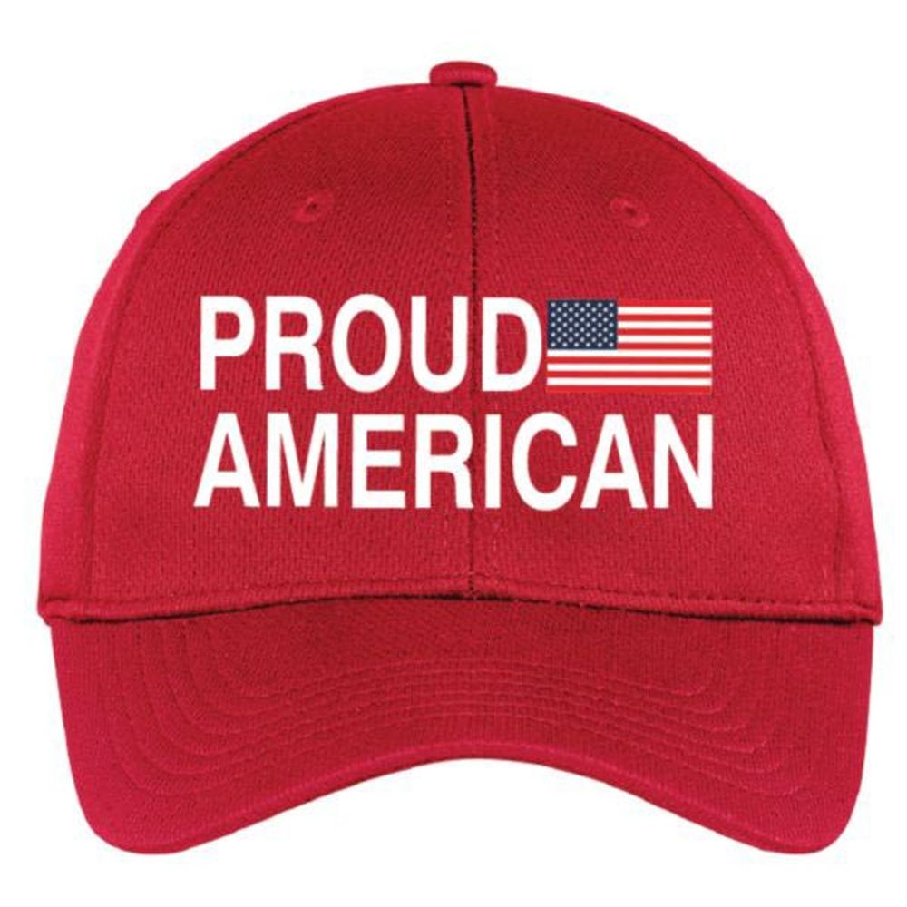 PROUD AMERICAN with USA Flag Embroidered Red Performance Ball Cap