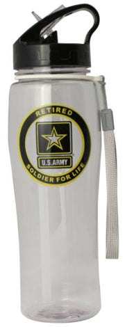 U.S. Army Retired Soldier For Life Logo Black and Gold Imprint on Clear Water Bottle