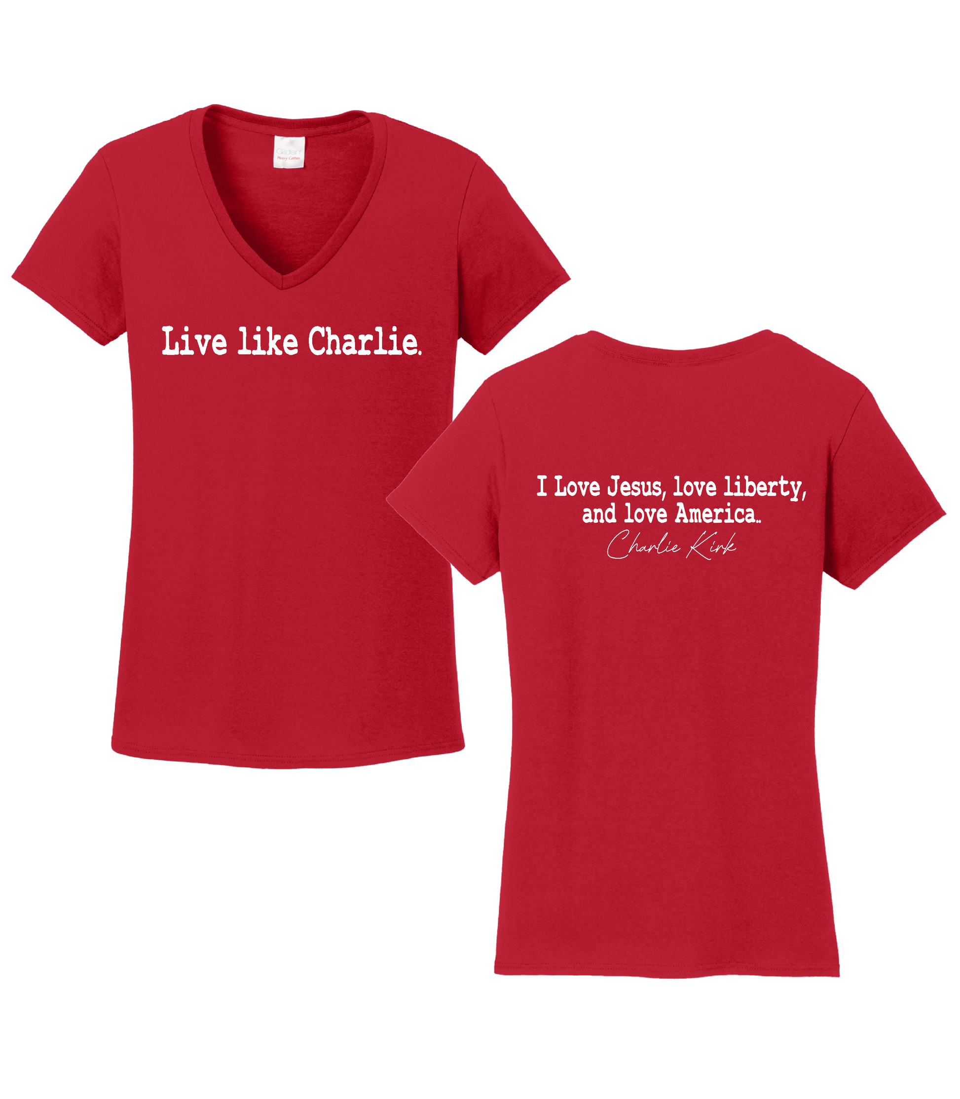 Our Live Like Charlie Ladies T-Shirt has a stylish V-Neck, and is printed on a Rich Red Ladies T-Shirt.
